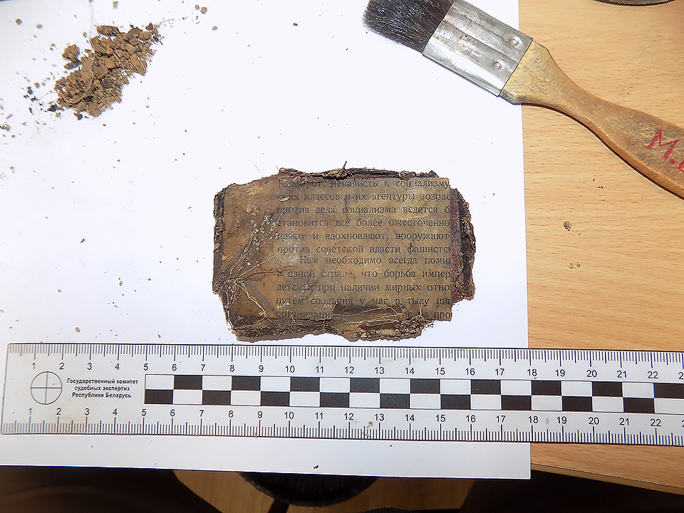 Магілёўскія эксперты аднавілі фрагмент лістка часоў Вялікай Айчыннай вайны, знойдзенага пры раскопках на Буйніцкім полі. Пра гэта паведаміла галоўны спецыяліст па працы са СМІ упраўлення Дзяржаўнага камітэта судовых экспертыз па Магілёўскай вобласці Ірына Рачкоўская.