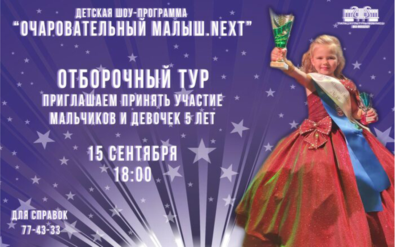Адборачны этап дзіцячай шоу-праграмы «Чароўны малы.Next –2020» пройдзе 15 верасня ў 18.00 у Палацы культуры вобласці. Для ўдзелу ў конкурсе запрашаюцца хлопчыкі і дзяўчынкі ва ўзросце ад 5 да 6 гадоў, як паведамляецца на афіцыйным сайце ўстановы культуры.