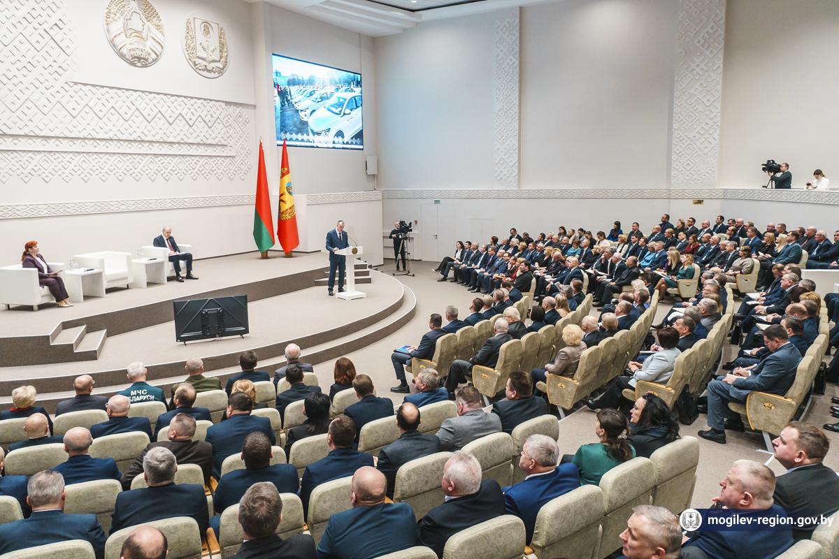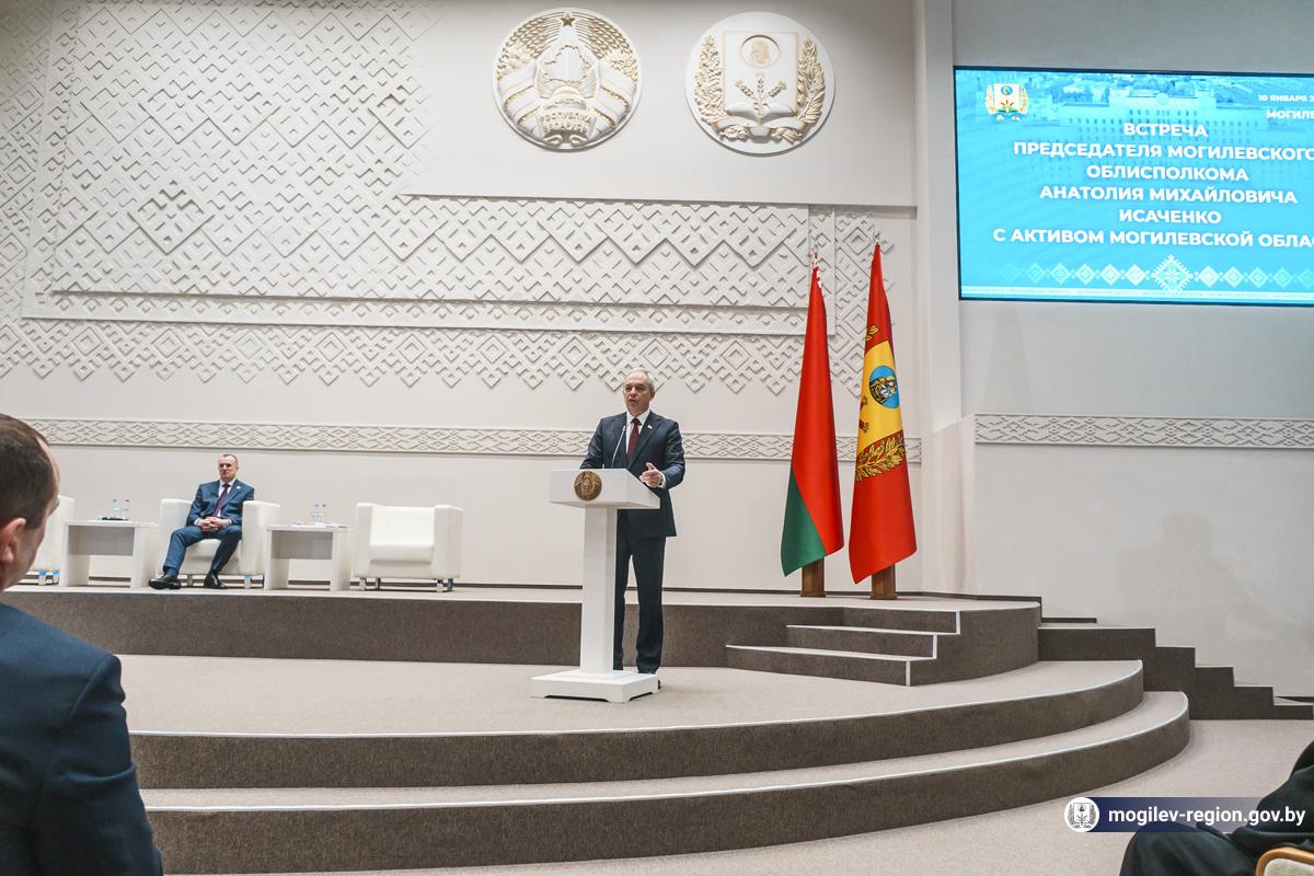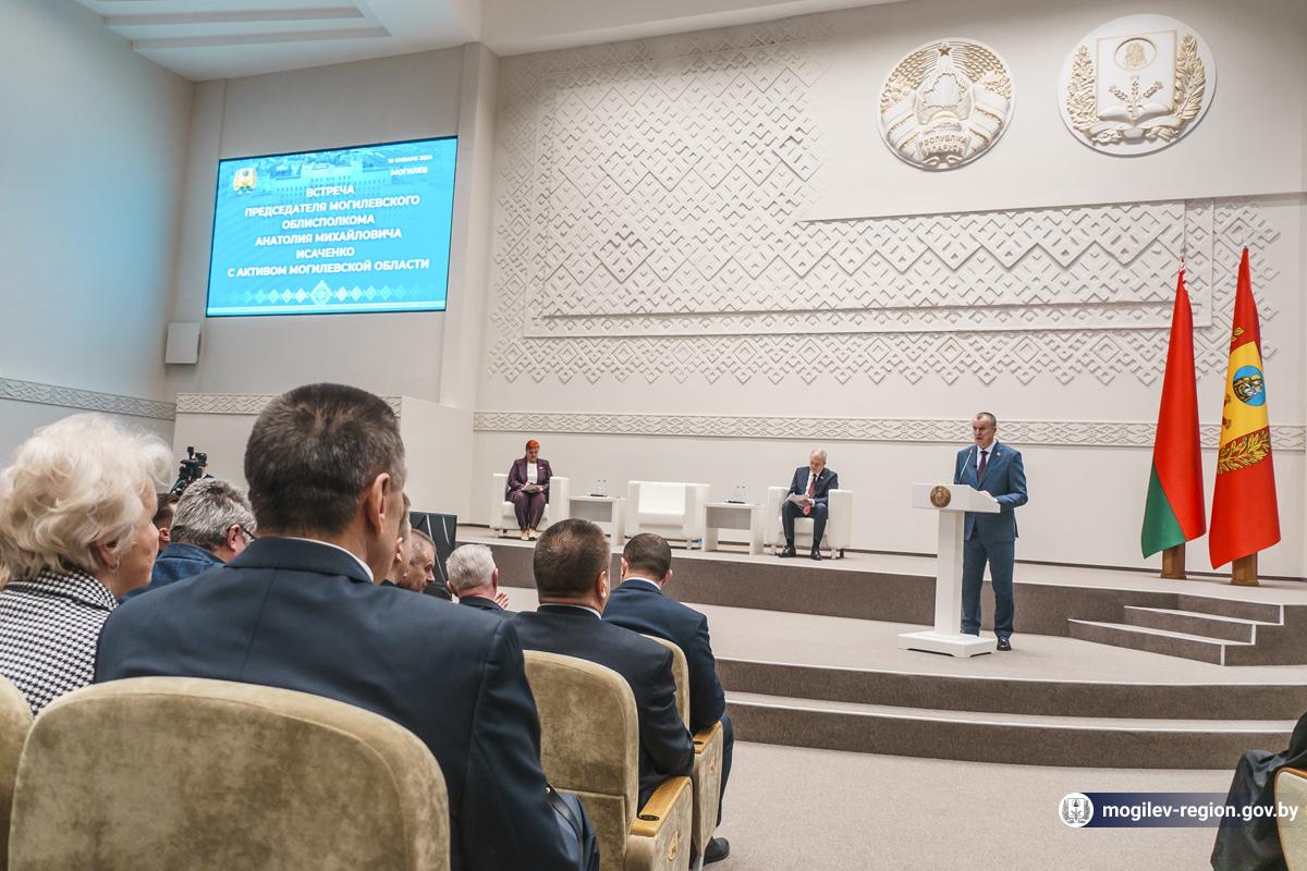 Старшыня Магілёўскага аблвыканкама Анатоль Ісачанка правёў сёння сустрэчу з актывам рэгіёну. Удзельнікамі сустрэчы ў Магілёўскім аблвыканкаме сталі кіраўнік Адміністрацыі Прэзідэнта Беларусі Ігар Сергяенка, члены Савета Рэспублікі, дэпутаты Палаты прадстаўнікоў Нацыянальнага сходу, старшыня Магілёўскага абласнога Савета дэпутатаў Ірына Раінчык, дэпутаты абласнога, гарадскіх і раённых Саветаў дэпутатаў, прадстаўнікі структур і падраздзяленняў абласнога, гарадскога і раённых выканкамаў, кіраўнікі прадпрыемстваў і ўстаноў, прадстаўнікі медыцыны, адукацыі, сілавых структур, сельскай гаспадаркі, прамысловасці і будаўнічай галіны, духавенства, грамадскіх аб'яднанняў і палітычных партый, ганаровыя жыхары, ветэраны працы.