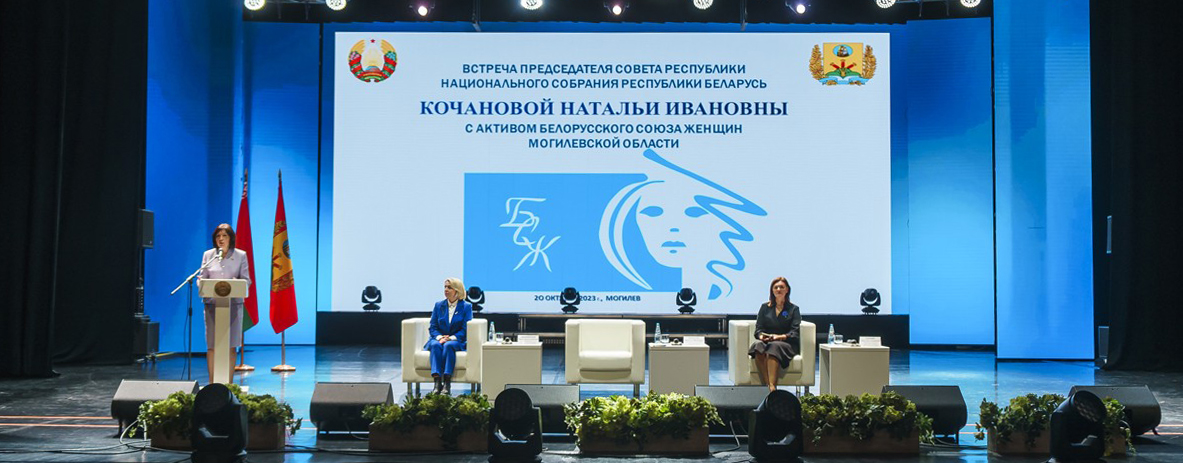 Председатель Совета Республики Национального Собрания Республики Беларусь Наталья Кочанова встретилась сегодня с активом Белорусского союза женщин Могилевщины. Аналогичные встречи ранее прошли практически во всех областных центрах, и с каждым разом количество желающих принять в них участие прирастало. Так, во Дворце культуры области собралось их рекордное число – порядка 1 тыс. участников. Также ко встрече присоединились председатель Белорусского союза женщин Ольга Шпилевская, председатель областного Совета депутатов Ирина Раинчик, заместитель председателя облисполкома Валерий Малашко, председатель областной организации БСЖ Алла Галушко.