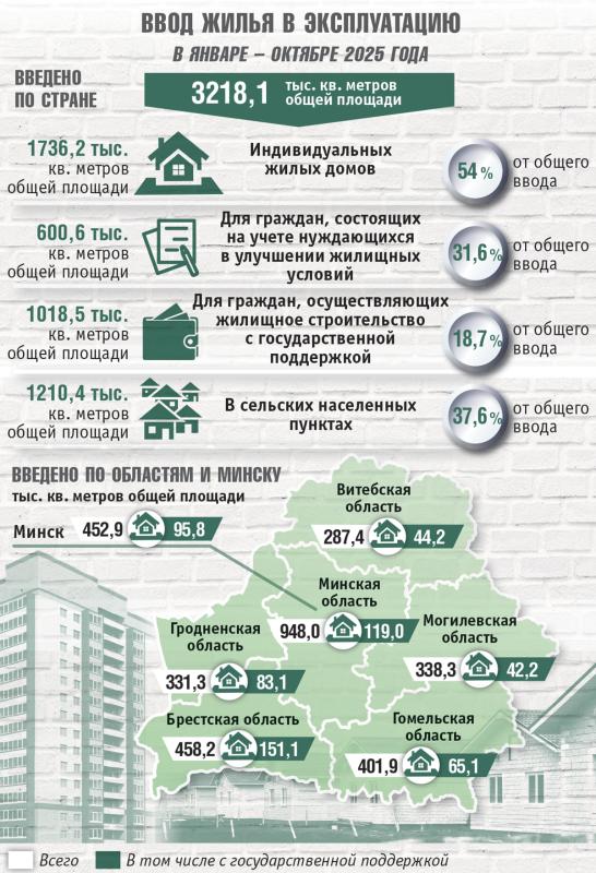 По информации Белстата, за десять месяцев текущего года организациями всех форм собственности в стране построено 33,7 тысячи новых квартир. Введено в эксплуатацию 3218,1 тысячи квадратных метров общей площади жилья.