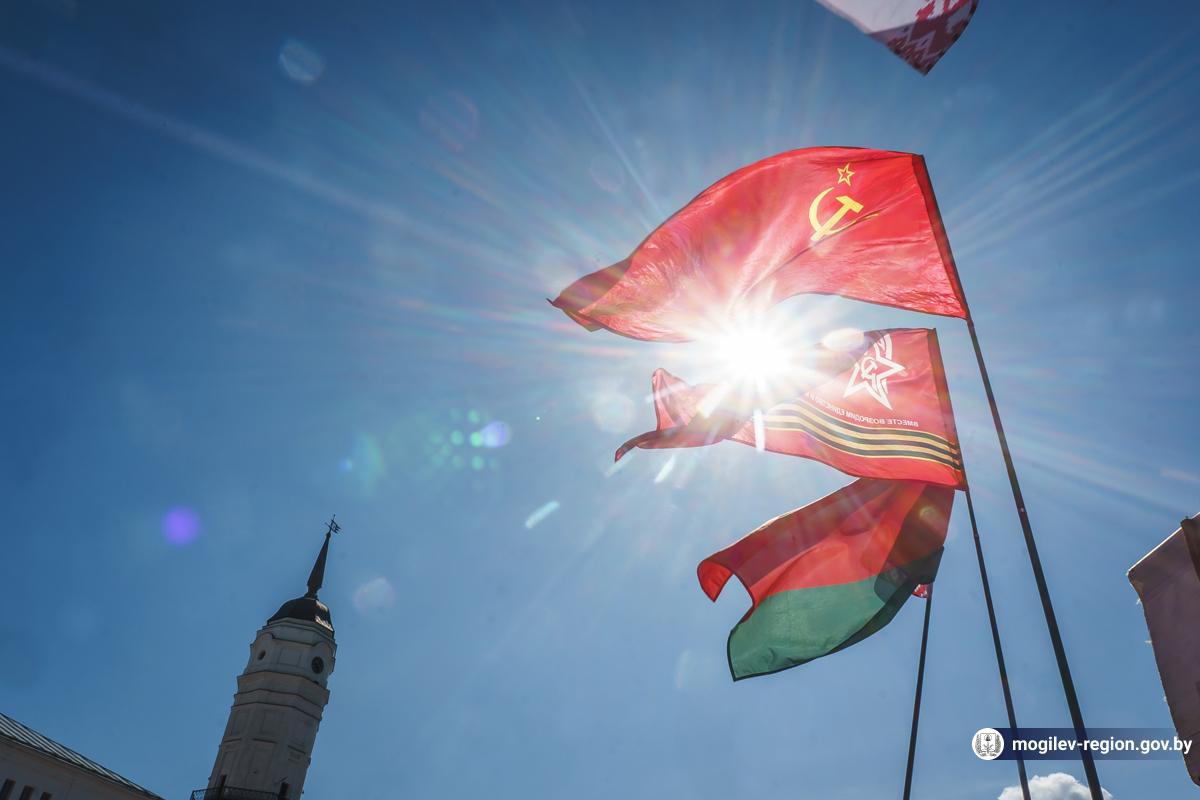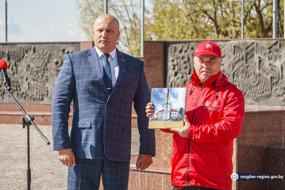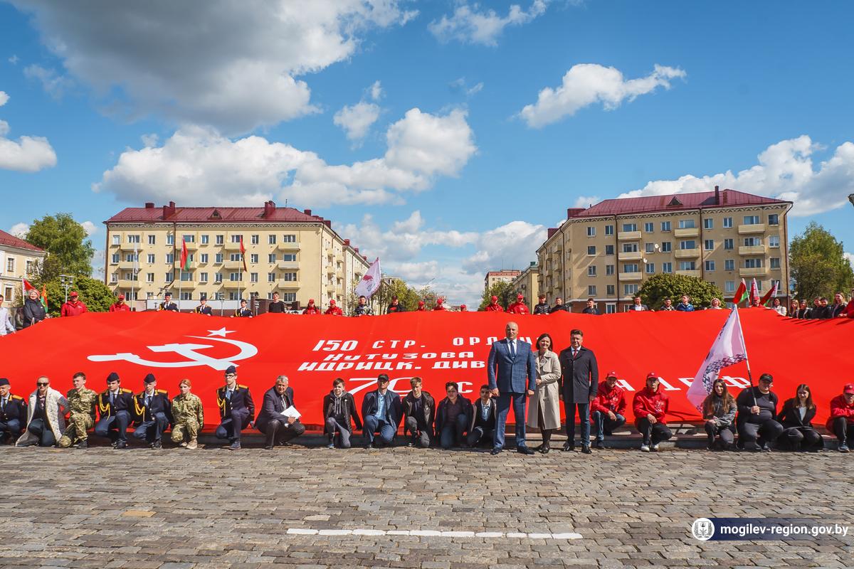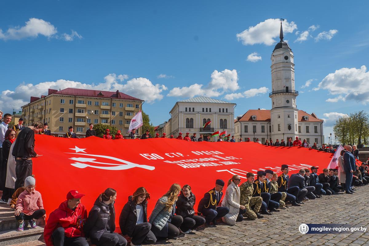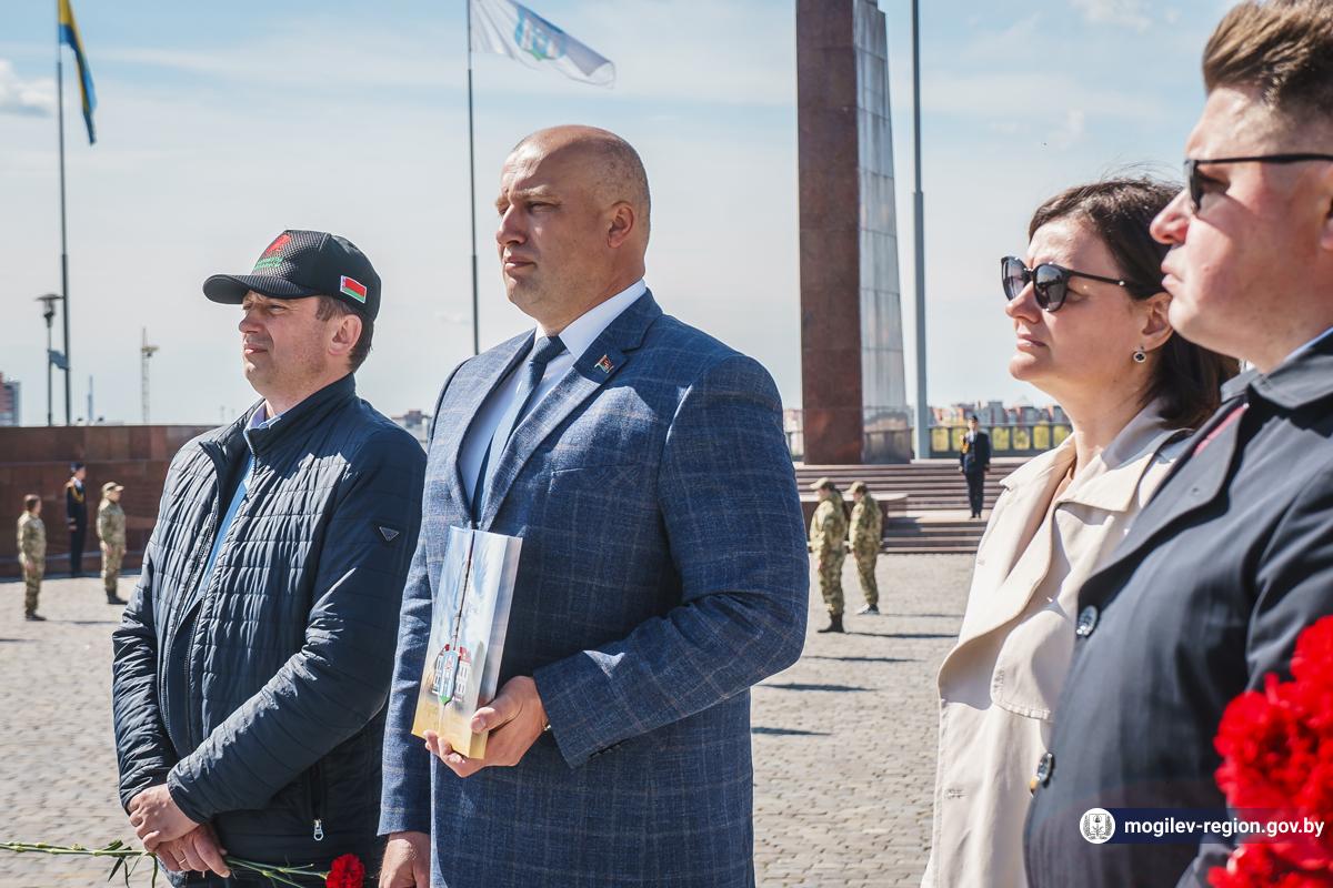 В Могилев прибыли участники союзного патриотического марша-эстафеты проекта «Наша великая Родина», посвященного 78-й годовщине Победы. В ходе визита российских гостей на площади Славы состоялся митинг с участием руководства Могилева. Председатель Могилевского городского Совета депутатов Максим Гурин вручил координатору проекта Олегу Слюсаренко памятную книгу о городе. После возложения цветов к Вечному огню, прибывшие гости совместно с могилевчанами развернули главный символ «Союзного проекта» - масштабную копию Знамени Победы.