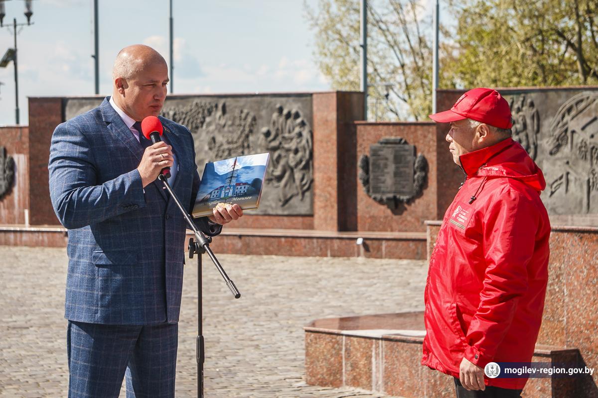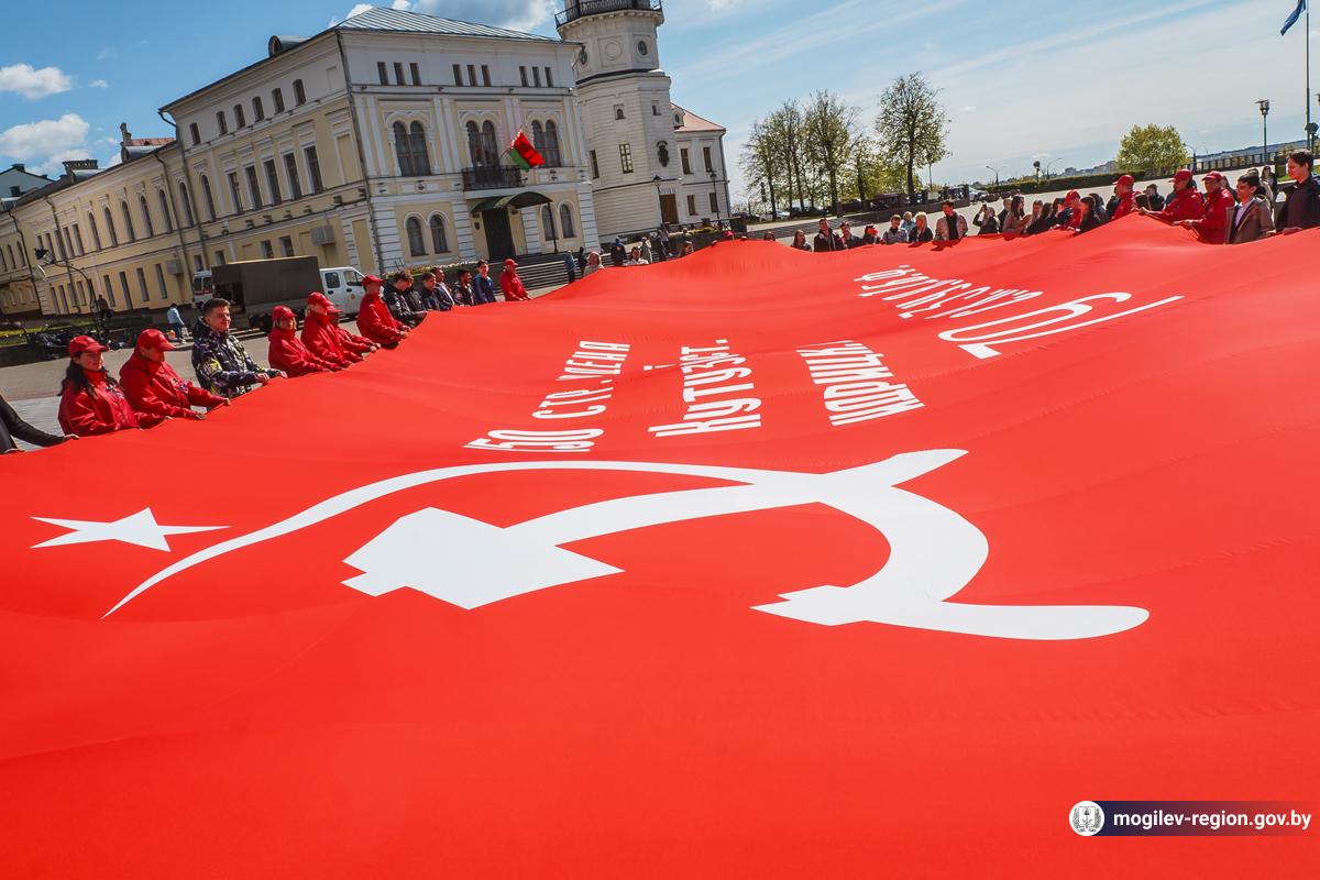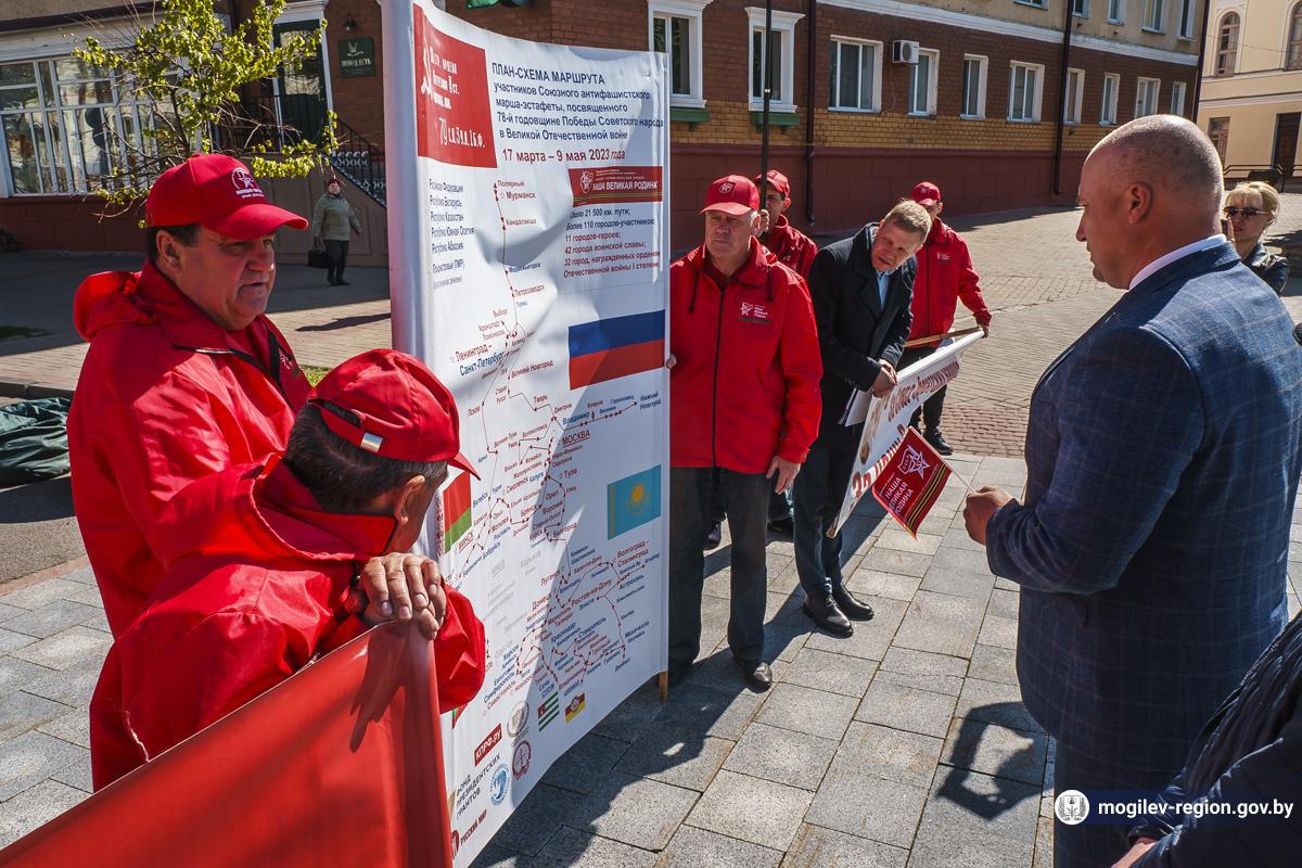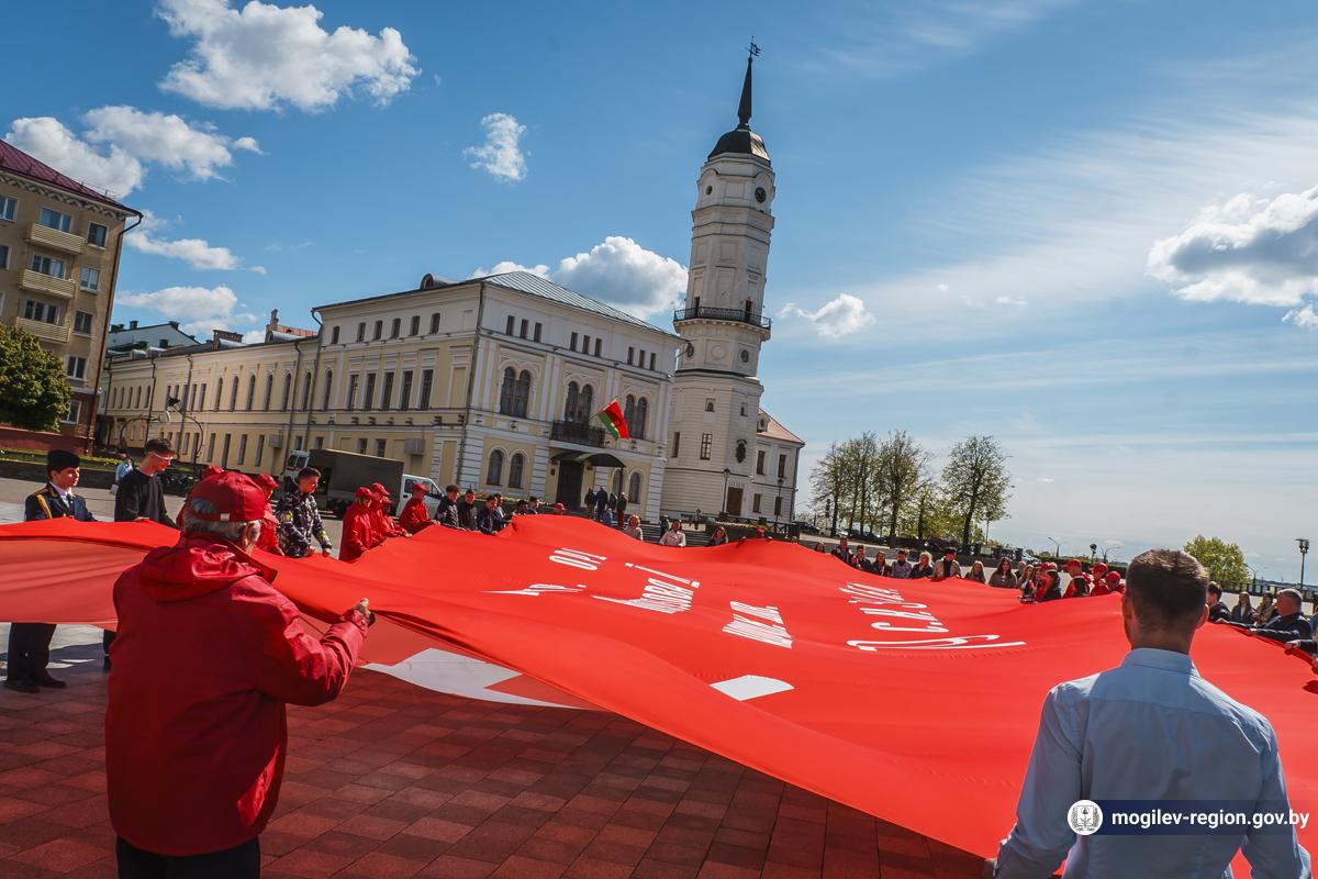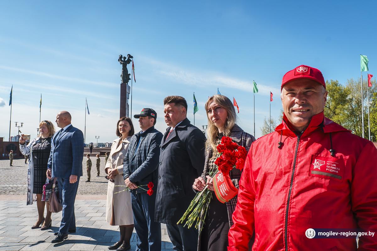 В Могилев прибыли участники союзного патриотического марша-эстафеты проекта «Наша великая Родина», посвященного 78-й годовщине Победы. В ходе визита российских гостей на площади Славы состоялся митинг с участием руководства Могилева. Председатель Могилевского городского Совета депутатов Максим Гурин вручил координатору проекта Олегу Слюсаренко памятную книгу о городе. После возложения цветов к Вечному огню, прибывшие гости совместно с могилевчанами развернули главный символ «Союзного проекта» - масштабную копию Знамени Победы.